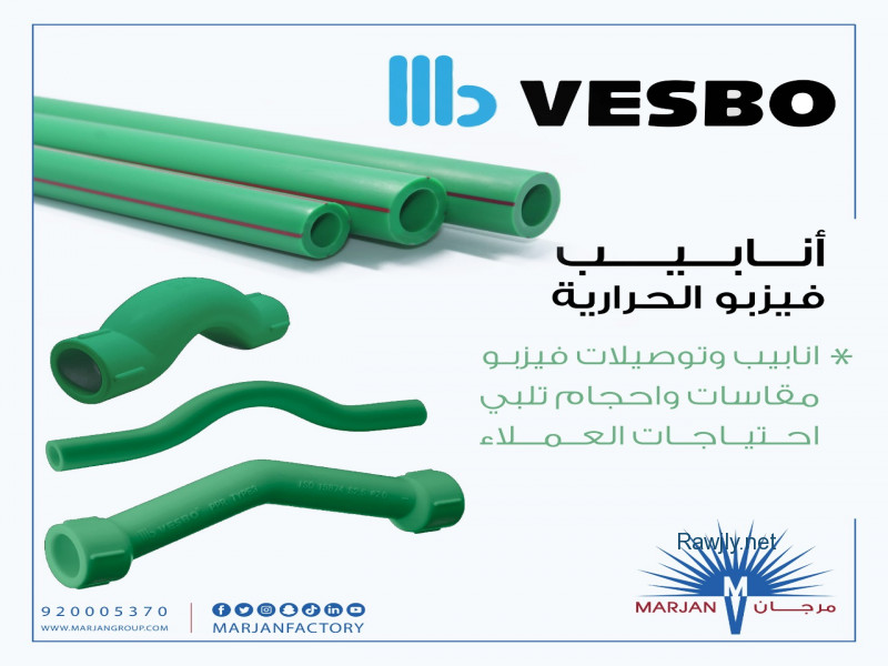 شركة حسام المهيدب لتوريد الانابيب الحرارية من مصنع مرجان المهيدب علامة تجارية رائدة في صناعة الأنابيب الحرارية منذ عام 1992 . تنتج شركة فيزبو الأنابيب والتوصيلات بأحجام مختلفة ومتنوعة . تقود مسار البحث والتطوير والتصنيع لارضاء جميع شرائح عملائها. تلتزم بتحسين احتياجات الاسكان والمعيشة والنهوض بالرفاهية فالمنزل لا يعد مسكناً حتى صبح آمناً وصحياً . تركيزنا دائما على الانصات الى احتياجات السوق والعملاء لإنشاء أنابيب عالية الجودة للمنازل والمدن . المزايا والخصائص: صحية وغير سامة ومقاومة للضوء ويمكن استخدامها بأمان لمياه الشرب النقي ونظام أنابيب مياه الشرب مقاومة للتآكل والصدأ. مما يجعلها آمنة داخل الجدران ولا تتسبب في مشاكل تسريب أو تهريب داخلية مقاومة لدراجات الحرارة العالية . بالرغم من متانتها الا انها خفيفة الوزن قياسا بالانابيب المعدنية . سهلة التركيب وموثوق بلحامها . جميلة المنظر في حال تركيبها خارج الجدران . الاستخدام: شبكات تغذية المياه الرئيسية الباردة والساخنة شبكات توزيع المياه الداخلية للحمامات والمطابخ شبكات الهواء المضغوط في المصانع شبكات التبريد والتدفئة شبكات الري محطات معالجة المياه المنشآت الصناعية المختلفة مثل الكيماوية والغذائية والدوائية المستشفيات والمراكز الطبية خطوط السوائل الغذائية مثل الألبان والعصائر