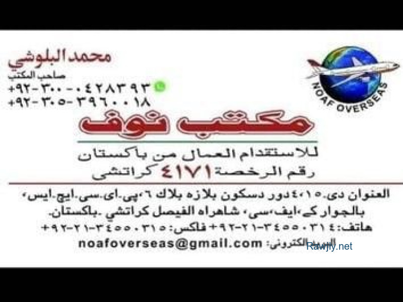 للاستقدام من باكستان.... يسرنا تقديم عرضنا المميز لتوفير العمالة من دولة باكستان نحن بعون الله نقوم بتخليص جميع الاجراءات المطلوبه ونجلب لكم على حسب شروطكم ونمدكم بما تحتاجونه من العمالة المؤهلة في كافة المجالات المرخصة لتقديم الموارد البشرية الفنية والمؤهلة نستطيع أن نوفر لكم أفضل الأيادي العاملة ونضمنها لكم لدينا فريق متخصص لدراسة طلباتكم وإجراء المقابلات واختبار المتقدمين والتأكد من الحصول على أفضل المرشحين..... لتواصل جوال واتساب محمد البلوشي 00923000428393